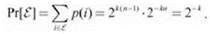 Предположим, нас интересует вероятность того, что процессы р1 и р2 выберут одинаковые идентификаторы. Это событие E представляется подмножеством, состоящим из всех n-кортежей из Ω с совпадающими первыми двумя координатами. Количество таких n-кортежей равно 2k(n - 1); для координат с 3 по n можно выбрать любое значение, затем для координаты 2 тоже выбирается любое значение, но при выборе координаты 1 свобода полностью отсутствует. Таким образом, получаем