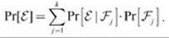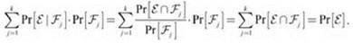 Теперь предположим, что значения Рr[Fj] известны и мы также можем определить Рr[e | Fj] для всех j = 1, 2, ..., k. Следовательно, вероятность события E можно определить в предположении о том, что произошло любое из событий Фj. Тогда Рr[E] вычисляется по следующей простой формуле: