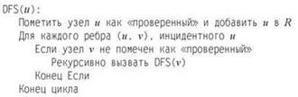 Алгоритм DFS также является конкретной реализацией общего алгоритма расширения компоненты, представленного выше. Проще всего описать его в рекурсивной форме: DFS можно запустить от любой начальной точки, но с хранением глобальной информации об уже посещенных узлах.