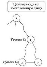 Рис. 3.6. Если два одноуровневых узла х и у соединены ребром, то цикл через х, у и их низшего общего предка z имеет нечетную длину; это показывает, что граф не может быть двудольным