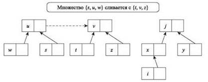 Рассмотрим операцию Union для двух множествA и B. Предположим, что имя, использованное для множества A, определяется узлом v ∈ A, тогда как множество B названо по имени узла u ∈ B. Идея заключается в том, чтобы объединенному множеству было присвоено имя и или v; допустим, в качестве имени выбирается v. Чтобы указать, что мы выполнили объединение двух множеств, а объединенному множеству присвоено имя v, мы просто обновляем указатель u так, чтобы он ссылался на v. Указатели на другие узлы множества B при этом не обновляются.