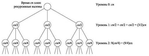 ♦ Анализ нескольких начальных уровней: пример приведен для случая q = 3 на рис. 5.2. На первом уровне рекурсии имеется одна задача с размером n, которая выполняется за время cn плюс время, потраченное на все последующие рекурсивные вызовы. На следующем уровне имеются q задач с размером n/2. Каждая задача выполняется за время максимум cn/2, что дает в сумме (q/2) cn плюс время последующих рекурсивных вызовов. На следующем уровне используются q2 задач с размером n/4 с общим временем (q2/4)cn. Мы видим, что при q > 2 общий объем работы на уровень возрастает с увеличением уровня.