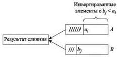 Итак, главной частью процесса станет процедура “слияния с подсчетом”. Предположим, мы рекурсивно отсортировали первую и вторую половины списка и подсчитали инверсии в каждой половине. Теперь имеются два отсортированных списка A и B, содержащих первую и вторую половины соответственно. Мы хотим объединить их с построением одного отсортированного списка C, одновременно подсчитав пары (a, b), у которых a ∈ A, b ∈ B, и a > b. По приведенному выше определению это именно то, что необходимо для “объединяющего” шага, вычисляющего количество инверсий между половинами.