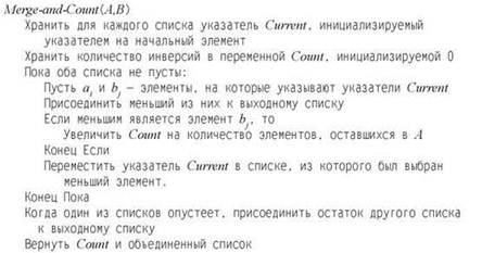 Эта задача тесно связана с более простой задачей из главы 2, в которой был сформирован соответствующий “объединяющий” шаг для сортировки слиянием: тогда у нас были два отсортированных списка A и B, которые нужно было объединить в один отсортированный список за время O(n). На этот раз нужно сделать кое- что еще: не только построить один отсортированный список из A и B, но и подсчитать количество “инвертированных пар” (a, b), для которых a ∈ A, b ∈ B, и a > b.