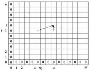 Рис. 6.11. Двумерная таблица значений OPT. Крайний левый столбец и нижняя строка всегда содержат 0. Значение OPT(i, w) вычисляется по двум другим элементам — OPT(i - 1, w) и OPT(i - 1, w - wi) в соответствии со стрелками
