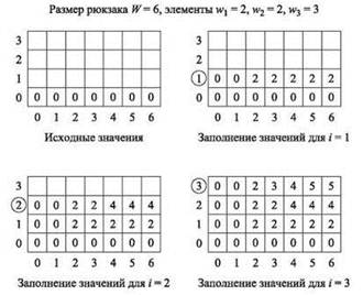 В качестве примера выполнения этого алгоритма рассмотрим экземпляр с предельным весом W = 6 и n = 3 элементами с размерами w1 = w2 = 2 и w3 = 3. Оптимальное значение OPT(3, 6) = 5 достигается при использовании третьего элемента и одного из первых двух элементов. На рис. 6.12 продемонстрирован процесс заполнения алгоритмом двумерной таблицы значениями OPTстрока за строкой.