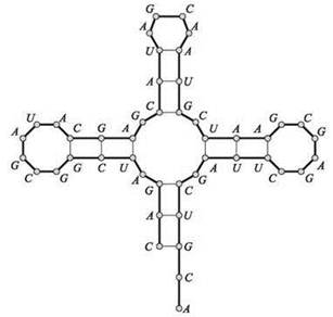 Одноцепочечные молекулы РНК являются ключевыми компонентами многих процессов, происходящих в клетках, и строятся по более или менее одинаковым структурным принципам. Однако в отличие от двухцепочечной ДНК, у РНК не существует “второй цепи” для связывания, поэтому РНК обычно образует пары оснований сама с собой; это приводит к образованию интересных форм наподобие изображенной на рис. 6.13. Совокупности пар (и полученная форма), образованные молекулой РНК в этом процессе, называются вторичной структурой; понимание вторичной структуры необходимо для понимания поведения молекулы.