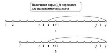 В первом случае имеем OPT(i, j) = OPT(i, j - 1). Во втором случае, изображенном на рис. 6.15, b, порождаются две подзадачи OPT(i, t - 1) и OPT(t + 1, j - 1); как было показано выше, эти две задачи изолируются друг от друга условием отсутствия пересечений.