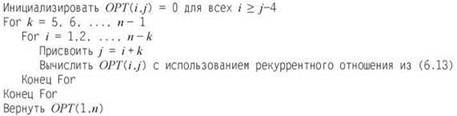 Найти границу для времени выполнения несложно: существуют O(n2) подзадач, которые необходимо решить, а вычисление рекуррентного отношения в (6.13) занимает время O(n) для каждой задачи. Следовательно, время выполнения будет равно O(n3).