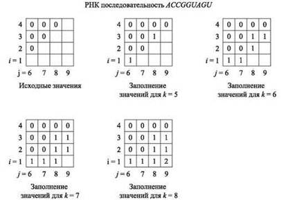 Рис. 6.16. Итерации алгоритма для конкретного экземпляра задачи предсказания вторичной структуры РНК
