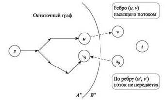 Теперь предположим, что e' = (u', v') является ребром в G, для которого u' ∈ B* а v' ∈ A*. Можно утверждать, что f(e') = 0. Если бы это было не так, то ребро e' породило бы обратное ребро e" = (v', u') в остаточном графе Gf, а поскольку v' ∈ A* в Gf существует путь s-v'; присоединяя e" к этому пути, мы получаем путь s-u' в Gf, что противоречит предположению о u' ∈ B*.