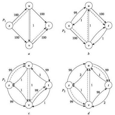 Чтобы понять, насколько плохо может сложиться ситуация, рассмотрим граф на рис. 7.2, но со следующими пропускными способностями: ребра (s, v), (s, u), (v, t) и (u, t) имеют пропускную способность 100, а у ребра (u, v) пропускная способность равна 1 (рис. 7.6). Легко увидеть, что максимальный поток равен 200: f(e) = 100 для ребер (s, v), (s, u), (v, t) и (u, t), а для ребра (u, v) он равен 0. Этот поток может быть получен в результате серии из двух увеличений, использующих пути с узлами s, u, t и s, v, t. Но подумайте, насколько плохо поведет себя алгоритм Форда-Фалкерсона при аномальном выборе увеличивающих путей. Допустим, мы начинаем с увеличивающего пути P1, содержащего узлы s, u, v, t в указанном порядке (рис. 7.6). Для этого пути bottleneck(P1, f) = 1. После увеличения имеем f(e) = 1 для ребра e = (u, v), поэтому в остаточном графе появляется обратное ребро. Для следующего увеличивающего пути выбирается путь Р2 путь Р2 из узлов s, v, u, t в таком порядке. При втором увеличении мы также получаем bottleneck(P2, f) = 1. После второго увеличения имеем f(e) = 0 для ребра e = (u, v), поэтому ребро снова находится в остаточном графе. Далее P1 и P2 поочередно выбираются для увеличения. В этом случае для того, чтобы добраться до желаемого потока с величиной 200, потребуется 200 увеличений. Именно эта граница была доказана в (7.4), так как в данном примере C = 200.