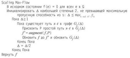 Пусть Gf(Δ) — подмножество остаточного графа, состоящее только из ребер с пропускной способностью не менее Δ. Мы будем работать со значениями Δ, которые являются степенью 2. Ниже приведен алгоритм.