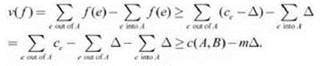 (7.18) Пусть f — поток в конце фазы Δ-масштабирования. В G существует разрез s-t (A, B), для которого c(A, B) ≤ v(f) + mΔ, где m — количество ребер в графе G. Соответственно, величина максимального потока в сети не превышает v(f) + mΔ.