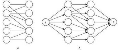 Рис. 7.9. a — двудольный граф; b — соответствующая потоковая сеть, в которой все пропускные способности ребер равны 1