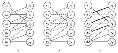 Рис. 7.10. a — двудольный граф с паросочетанием M; b — увеличивающий путь в соответствующем остаточном графе; c — паросочетание, полученное в результате увеличения
