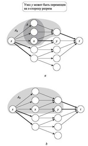 Рис. 7.11. a — минимальный разрез из доказательства (7.40); b — тот же разрез после перемещения узла у на сторону A'. Ребра, пересекающие разрез, выделены жирными линиями