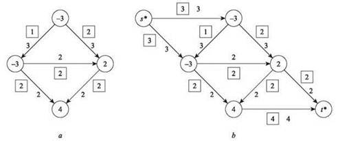 Для примера рассмотрим экземпляр задачи на рис. 7.13, а. На этой схеме два узла являются источниками (уровни потребления -3 и -3); два узла являются стоками, с уровнями потребления 2 и 4. Величины потока на схеме образуют действительную циркуляцию, так как все уровни потребления удовлетворяются в соответствии с пропускными способностями.