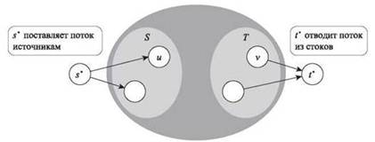 Преобразование очень похоже на то, которое использовалось в задаче о двудольном паросочетании: каждый узел в S связывается с “суперисточником” s*, а каждый узел в T — с “суперстоком” t. А конкретнее, граф G' строится на основе G добавлением в него новых узлов s* и t*. Для каждого узла v ∈ T — то есть для каждого узла v с dv > 0 — добавляется ребро (v, t*) с пропускной способностью dv. Для каждого узла u ∈ S — то есть для каждого узла с du < 0 — добавляется ребро (s*, u) с пропускной способностью - du. Остальная структура G переносится в G' без изменений.