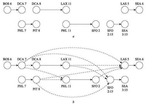 Рис. 7.17. a — простой экземпляр задачи планирования авиаперелетов; b — расширенный граф, показывающий возможности перехода между рейсами