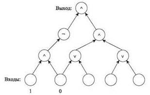 Для примера рассмотрим схему на рис. 8.4. Двум левым источникам присвоены значения 1 и 0, а следующие три источника соответствуют входам. Если подать на входы значения 1, 0, 1 (слева направо), то в логических элементах второй строки будут получены значения 0, 1, 1, в логических элементах третьей строки — значения 1, 1, и на выходе — значение 1.