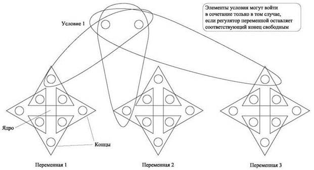 На языке трехмерных сочетаний это означает: “Сочетание по центрам регуляторов должно оставить свободными четные концы первого регулятора; или оно должно оставить свободными нечетные концы второго регулятора; или оно должно оставить свободными нечетные концы третьего регулятора”. Итак, мы добавляем регулятор условия, который делает именно это. Он состоит из множества двух элементов ядра P1 = {p1, p'1} и трех триплетов, их содержащих. Один триплет имеет форму (p1, p'1, b1j) для четного конца b1j; другой включает p1, p'1и нечетный конец b2j'; и третий включает p1, p'1и четный конец b3,j". Только эти три триплета покрывают P1, поэтому мы знаем, что один из них должен использоваться; тем самым точно обеспечивается соблюдение условия.