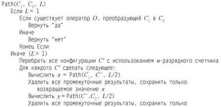 (9.8) Path(C1, С2, L) возвращает “да” в том, и только в том случае, если существует последовательность операторов длины не более L, ведущая из С1 в С2. Ее использование пространства полиномиально по n, k и log L.