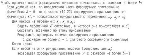 И наоборот, предположим, что существует такое условие Ci, что ρ не определяет никакие переменные в Ci способом, выполняющим Ci. Мы хотим показать, что ρ не является форсирующим, а для этого в соответствии с определением требуется представить присваивание, при котором выполняются не все условия. Рассмотрим следующее логическое присваивание v: v соответствует ρ по всем определенным переменным; присваивает произвольное логическое значение каждой неопределенной переменной, не входящей в Ci; и присваивает каждой неопределенной переменной в Ci значение, с которым условие не выполняется. Так как v присваивает каждой переменной в Ci значение, с которым оно не выполняется, следовательно, не является выполняющим присваиванием. Но v согласуется с ρ, а из этого следует, что оно не является форсирующим неполным присваиванием. ■