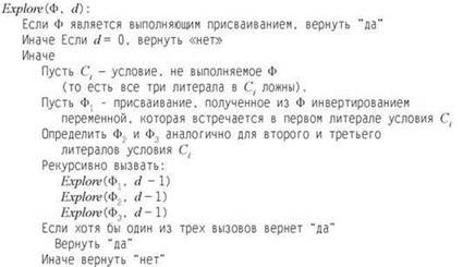 Попробуем действовать аналогично тому, как мы действовали при поиске малого вершинного покрытия. Выберем произвольное условие Cj, содержащее литералы хi, xj и хk (возможно, с инвертированием). Из (10.22) известно, что любое форсирующее присваивание ρ должно присвоить одной из этих трех переменных значение, входящее в Ci, поэтому мы можем опробовать все три возможности. Допустим, мы задали переменную xi так, как она входит в Ci; тогда из экземпляра можно исключить все условия (включая C'), выполняемые этим присваиванием хi, и попытаться выполнить оставшиеся. Назовем это уменьшенное множество условий экземпляром, сокращенным по присваиванию хi. То же самое можно сделать для хj и хk. Так как присваивание ρ должно определять одну из этих переменных в том состоянии, в каком она входит в C', а затем выполнять все остальное, нам удалось обосновать следующую аналогию с (10.3). (Чтобы упростить изложение, мы будем называть размером частичного присваивания количество определяемых им переменных.)