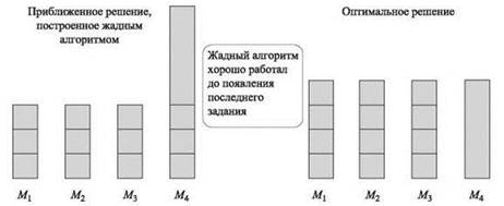 Как должно выглядеть оптимальное решение в этом примере? Оно назначает большое задание на одну из машин (допустим, M1) и равномерно распределяет остальные задания по остальным m- 1 машинам. Так достигается период выполнения m. Следовательно, соотношение между решением жадного алгоритма и оптимальным решением составляет (2m - 1)/m = 2 - 1/m, что близко к 2 при больших значениях m.