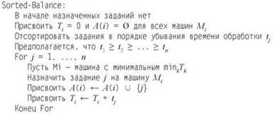 Начнем с рассмотрения очень простого жадного алгоритма. Алгоритм перебирает задания в любом порядке за один проход; когда очередь доходит до задания j, оно назначается на машину с минимальной на данный момент нагрузкой.