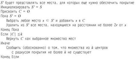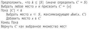 Предыдущий жадный алгоритм, располагая информацией о r, многократно выбирает одно из исходных мест s как следующий центр; при этом он убеждается в том, что это место находится на расстоянии не менее 2r от всех ранее выбранных мест. Чтобы добиться практически того же эффекта, не зная г, можно просто выбрать место s, самое дальнее от всех ранее выбранных центров: если существуют места, находящиеся на расстоянии не менее 2r от всех ранее выбранных мест, то это самое дальнее место s должно быть одним из них. Ниже приведено описание алгоритма.