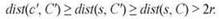 Пусть s — место, находящееся на расстоянии более 2r от каждого центра в C. Рассмотрим промежуточную итерацию в ходе выполнения цикла, к моменту которой было выбрано множество центров C'. Предположим, в этой итерации добавляется центр с'. Утверждается, что с' находится на расстоянии не менее 2r от всех мест в C'. Это следует из того, что место s находится на расстоянии более 2r от всех мест в большем множестве C, а мы выбираем место с, самое дальнее от всех ранее выбранных центров. Формально имеется следующая цепочка неравенств: