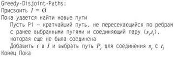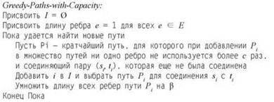 Запрет на использование одного ребра двумя путями — крайний случай; в большинстве практических применений ребра могут использоваться несколькими путями. Сейчас мы разработаем аналогичный алгоритм, базирующийся на методе назначения цены, для случая, когда любое ребро может использоваться в c > 1 путей. В только что рассмотренном случае без пересечений все ребра рассматривались как равные, а предпочтение отдавалось коротким путям. Эту схему можно представить как простую разновидность алгоритма назначения цены: пути должны “платить” за использование ребер, и у каждого ребра имеется стоимость. Сейчас будет рассмотрена схема назначения цены, в которой ребра считаются более дорогими, если они использовались ранее, а следовательно, у них осталось меньше свободной пропускной способности. При таком подходе алгоритм будет распределять свои пути вместо того, чтобы “сваливать” их на одно ребро. Мы будем называть стоимость ребра е его длиной l, а длина пути определяется как сумма длин содержащихся в нем ребер: