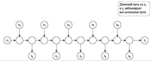 Рис. 11.9. В этом случае критично, чтобы жадный алгоритм выбора непересекающихся путей отдавал предпочтение коротким путям перед длинными