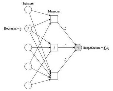 Рис. 11.12. Схема вычисления потока в сети, используемая для поиска решения (GL.LP). Ребра между заданиями и машинами обладают бесконечной пропускной способностью