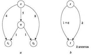 Чтобы понять, как возможность совместного использования влияет на поведение агентов, для начала рассмотрим пару очень простых примеров на рис. 12.8. В примере а у каждого из двух агентов есть два варианта построения пути: средний маршрут через v и внешний маршрут с использованием одного ребра. Предположим, каждый агент начинает с исходного пути, но постоянно пересчитывает текущую ситуацию, чтобы решить, возможно ли перейти на лучший путь.