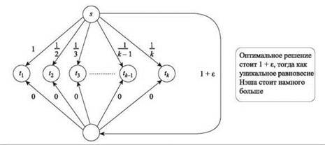 А теперь предположим, что существует другое равновесие Нэша. Чтобы оно отличалось от рассматриваемого решения, в нем должен быть задействован по крайней мере один из агентов, использующих внешний путь. Пусть tj1, tj2, ..., tjl — агенты, использующие внешний путь, где j1 < j2 < ... < jl. Тогда все эти агенты платят (1 + ε)/l. Но обратите внимание на то, что jl ≥ l, и у агента tjl есть возможность заплатить только 1/jl ≤ 1/l за счет использования альтернативного пути прямо из s. Следовательно, у tjl есть стимул для отклонения от текущего решения, а значит, решение не может быть равновесием Нэша. ■