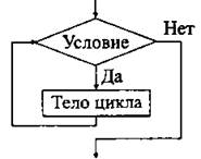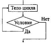 3. Структура цикл. Обеспечивает многократное выполнение некоторой совокупности действий, которая называется телом цикла. Циклы бывают трёх видов: с предусловием «пока-делай», с постусловием «делай-пока», со счётчиком «для».