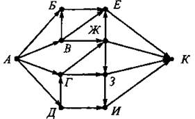 В9. На рисунке 16 изображена схема дорог, связывающих города А, Б, В, Г, Д, Е, Ж, 3, И, К. По каждой дороге можно двигаться только в одном направлении, указанном стрелкой. Сколько существует различных путей из города А в город К?