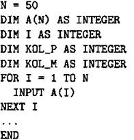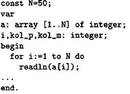Объявляем массив А из 50 элементов. Объявляем целочисленные переменные I,KOL_P и KOL_M. В цикле от 1 до 50 вводим элементы массива А с 1-го по 50-й. |