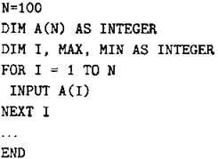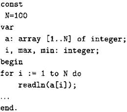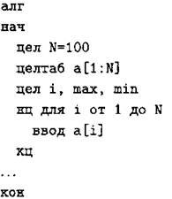 Объявляем массив А из 100 элементов. Объявляем целочисленные переменные I, МАХ, MIN. В цикле от 1 до 100 вводим элементы массива А с 1-го по 100-ый. ... |