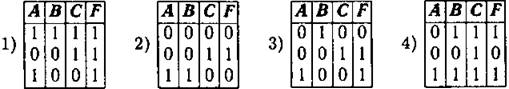 А3. Символом F обозначено логическое выражение от трёх аргументов А, В, С: (А → ¬В) v С. Какой из фрагментов таблиц истинности, приведённых ниже, соответствует данному выражениюF(A, B, C)?