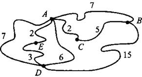 В9. В горах расположены пять населённых пунктов: А, В, С, D, E (см. рис. 67). Расстояния указаны в километрах.