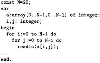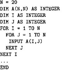 Объявляем двумерный массив А размером 20 на 20. Объявляем целочисленные переменные I, J. В цикле от 1 до 20 организуем внутренний цикл от 1 до 20, в котором вводим элементы массива А.