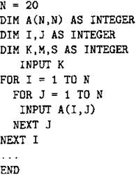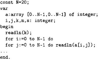 Объявляем двумерный массив А размером 20 на 20. Объявляем целочисленные переменные I, J, k, m, s. Вводим число k.