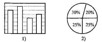 В5. Дан фрагмент электронной таблицы. Значения двух ячеек В1 и С2 не видны. По данным таблицы построены две диаграммы (см. рис. 76). Диаграмма 1) — по значениям ячеек диапазона А1 : D1, диаграмма 2) — по значениям ячеек диапазона А2 : D2.