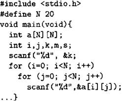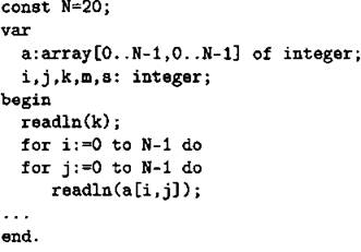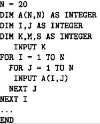 Объявляем двумерный массив А размером 20 на 20. Объявляем целочисленные переменныеI, J, k, m, s. Вводим число k.