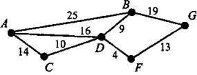 А2. На рисунке 83 изображена схема дорог между населёнными пунктами и обозначены расстояния (в км) между ними. (Населённые пункты обозначены латинскими буквами.) Определите маршрут, по которому можно попасть из пункта А в пункт G, преодолев наименьшее количество километров.