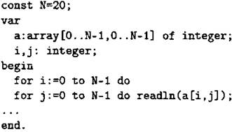 Объявляем двумерный массив А размером 20 на 20. Объявляем целочисленные переменные I, J. В цикле от 1 до 20 организуем внутренний цикл от 1 до 20, в котором вводим элементы массива А.